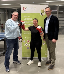 Nach dem Vortrag starten drei Workshops. In einem davon erzählen Kai Gutmann und Beke Bas vom „Parkinson-Boxen“. Vor einem halben Jahr hat die Sportschule Tosa Inu in Lemgo dieses neue Angebot organisiert und seitdem an die Bedürfnisse der Teilnehmenden angepasst. Kai Gutmann, Inhaber des Studios, erzählt: „Es ist sehr beeindruckend, wenn die Kursteilnehmer mit unsicheren Schritten zu uns ins Studio kommen und nach dem Training plötzlich selbstständig die Treppenstufen aus dem Studio heraus bewältigen können. Die Teilnehmer berichten uns: Ich hätte nie gedacht, dass ich mal wieder eine Treppe hochlaufe – einfach so.“